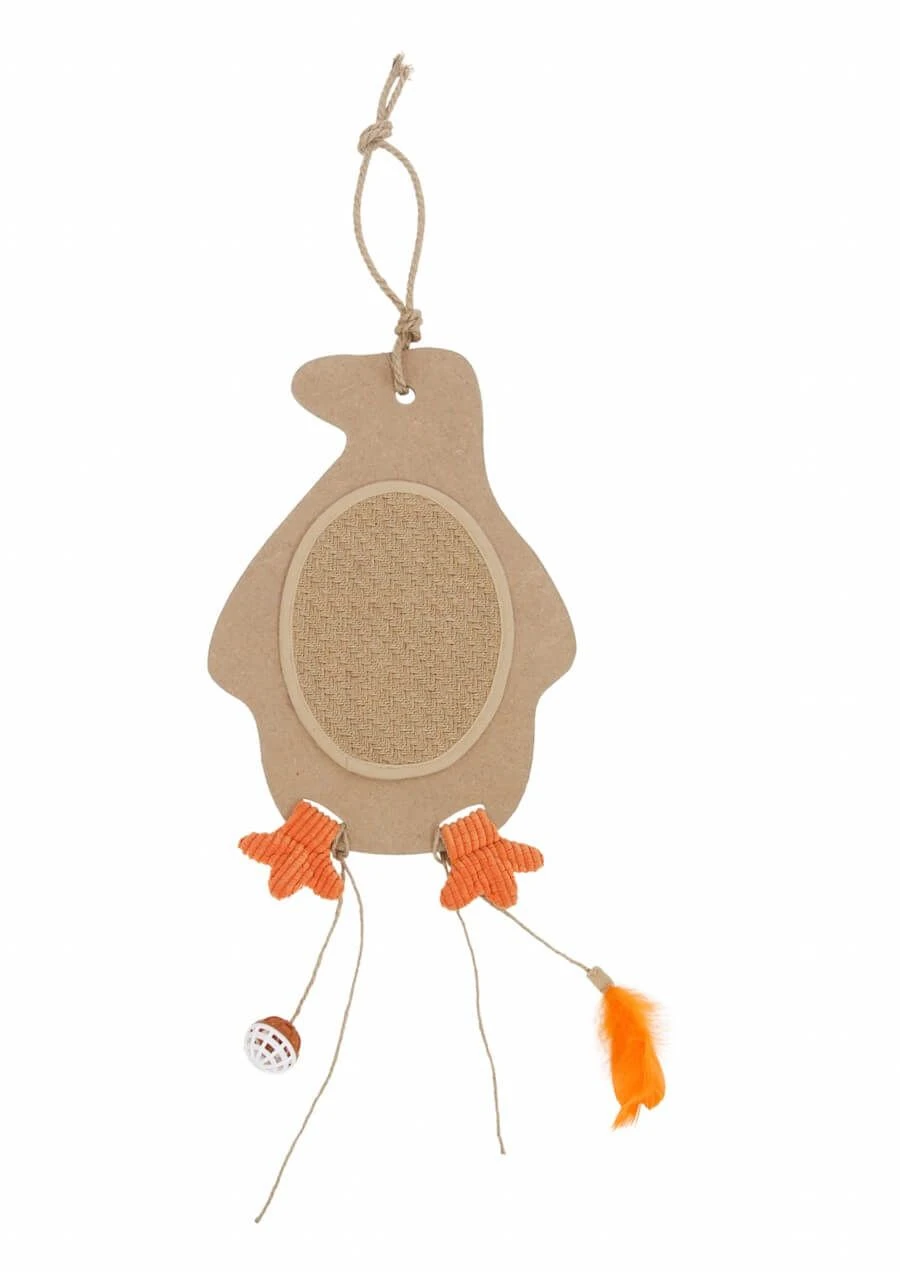 Pour susciter l’intérêt de votre chat, ce griffoir à suspendre intègre deux jouets (une balle et une plume).