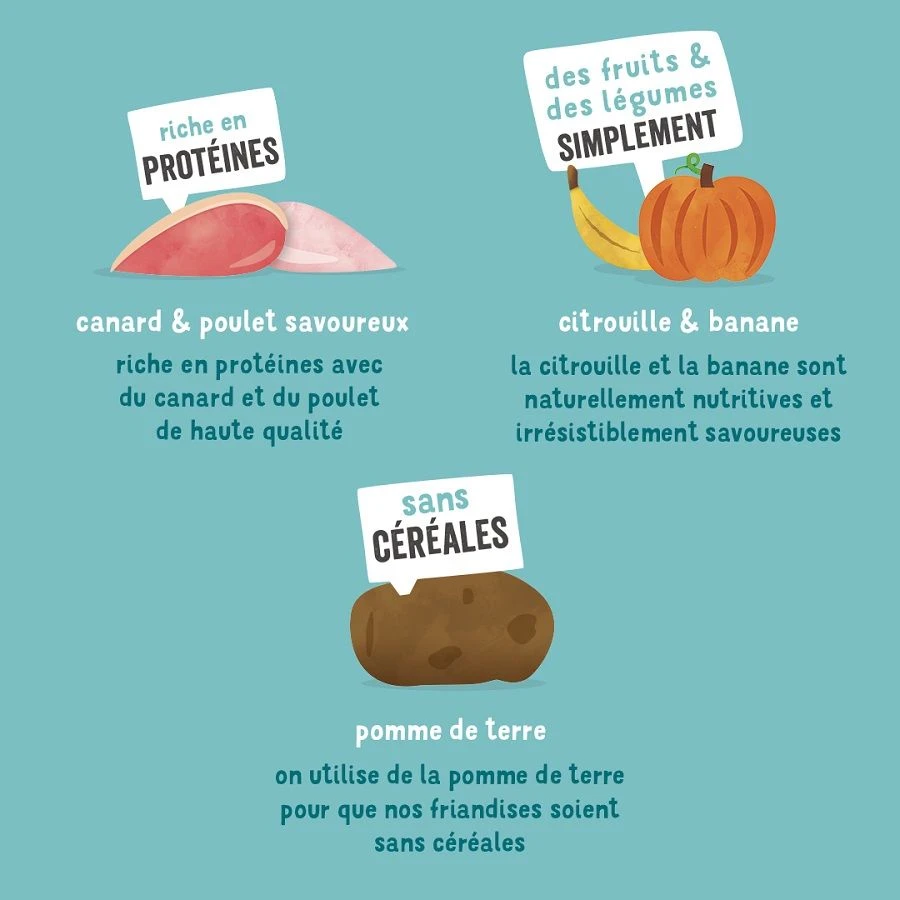 Préparées avec les meilleurs morceaux de canard et de poulet cuits en douceur, Les gourmandises sans céréales sont pleines de bienfaits naturels. De l’huile de colza est ajouté pour les rendre encore plus moelleuses, et du potiron et de la banane pour un supplément de bons points nutritionnels. Edgard & Cooper emballe les friandises dans des sacs 100% biodégradables, et – dernier détail mais pas le moindre – reverse 10% de ses profits à une clinique vétérinaire dédiée aux chiens au Sri Lanka.