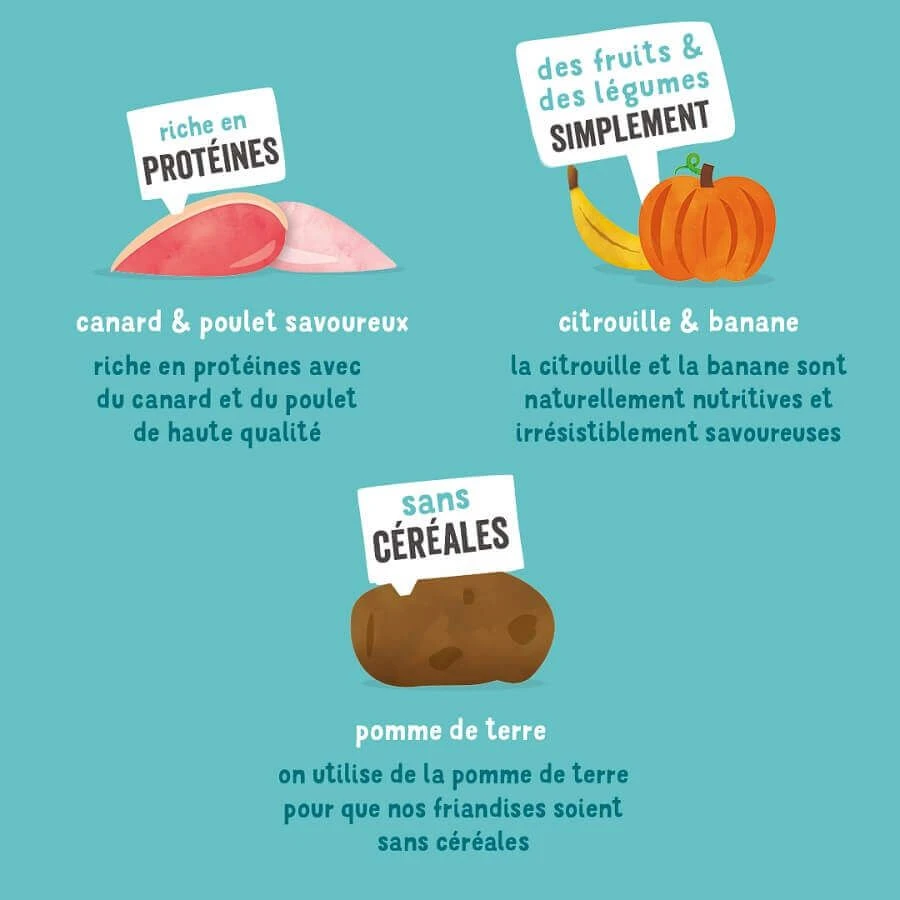 Edgard & Cooper prépare cette recette simple et sans céréales en utilisant un max de poulet riche en protéines, et un mélange spécial de myrtilles et de pomme. Edgard & Cooper y ajoute également une dose d’huile de colza pour les rendre encore plus moelleuses. Edgard & Cooper cuit lentement toutes ses friandises pour préserver leurs saveurs et leurs bienfaits, et les emballe soigneusement dans des sacs 100% biodégradables. Et, comme toujours, donne 10% de ses profits à une clinique vétérinaire dédiée aux chiens au Sri Lanka.