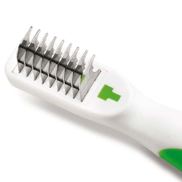 Le Peigne coupe noeuds de chez Gloria est un peigne qui permet de diviser les noeuds serrés et les retirer (en les coupants) les poils morts du sous poils de votre chien.