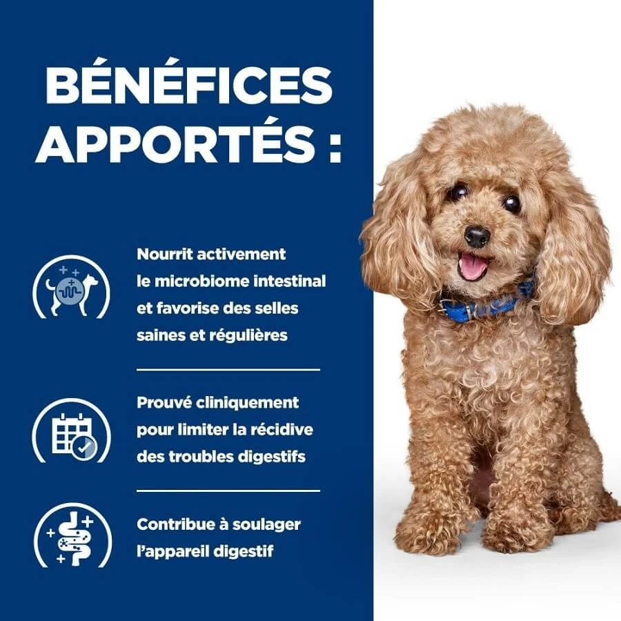 Les croquettes Hill’s Prescription Diet Gastrointestinal Biome Mini offrent une alimentation complète et équilibrée à votre chien mini. Cette alimentation clinique est adaptée aux chiens ayant des problèmes digestifs. Cet aliment va permettre de maintenir la bonne santé digestive de votre chien grâce à un mélange de fibres prébiotiques unique.