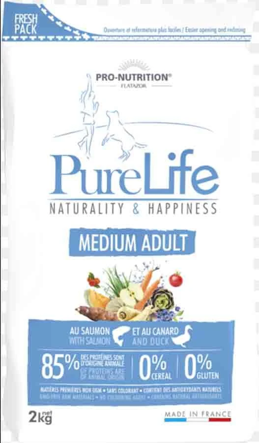 PureLife Medium Adult est une alimentation équilibrée et complète pour les chiens moyens. Il s’agit d’une alimentation au saumon et au canard contenant 85 % de protéines d’origine animale, c’est une recette sans céréales et sans gluten.